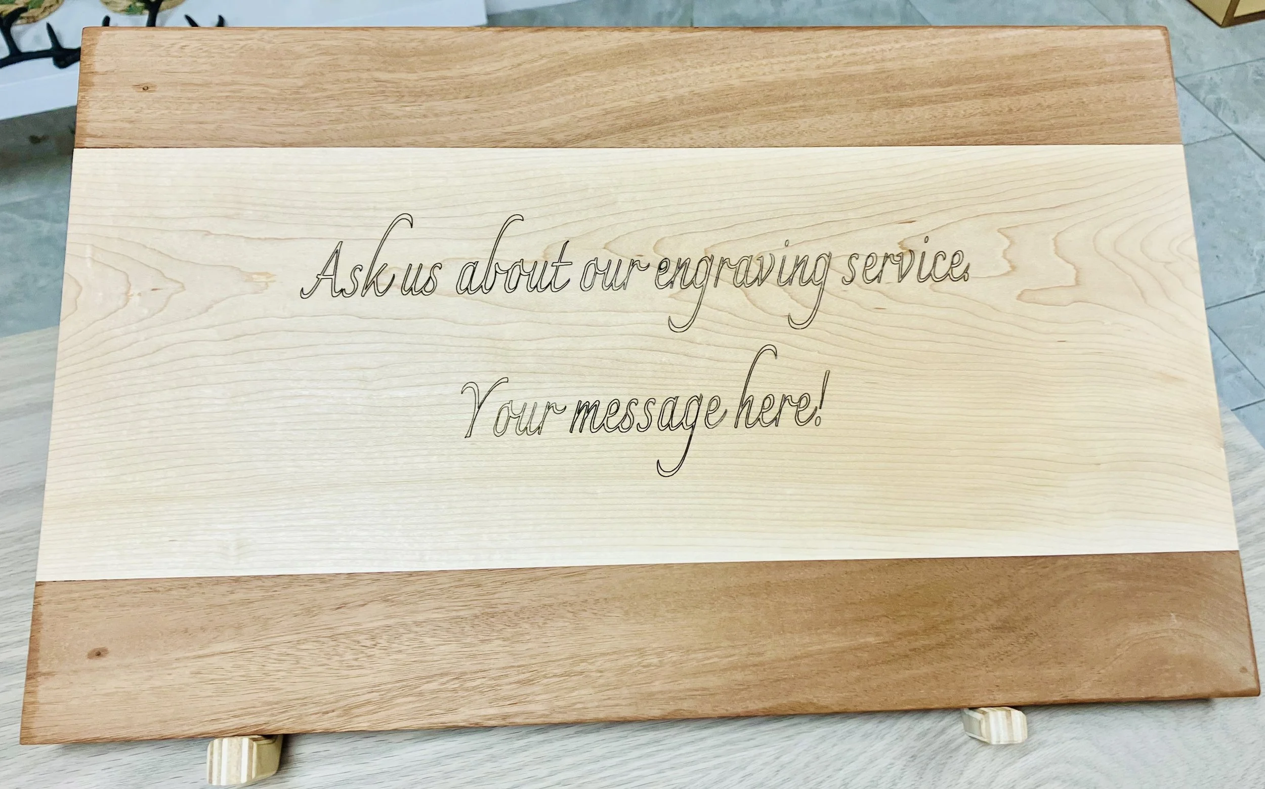 We make all of our cutting boards and charcuterie boards in-house and then engrave them to your specifications. You custom choose the size, wood type and engraving and then we do the rest! Contact us today via phone or our Contact page for advice and a quote.